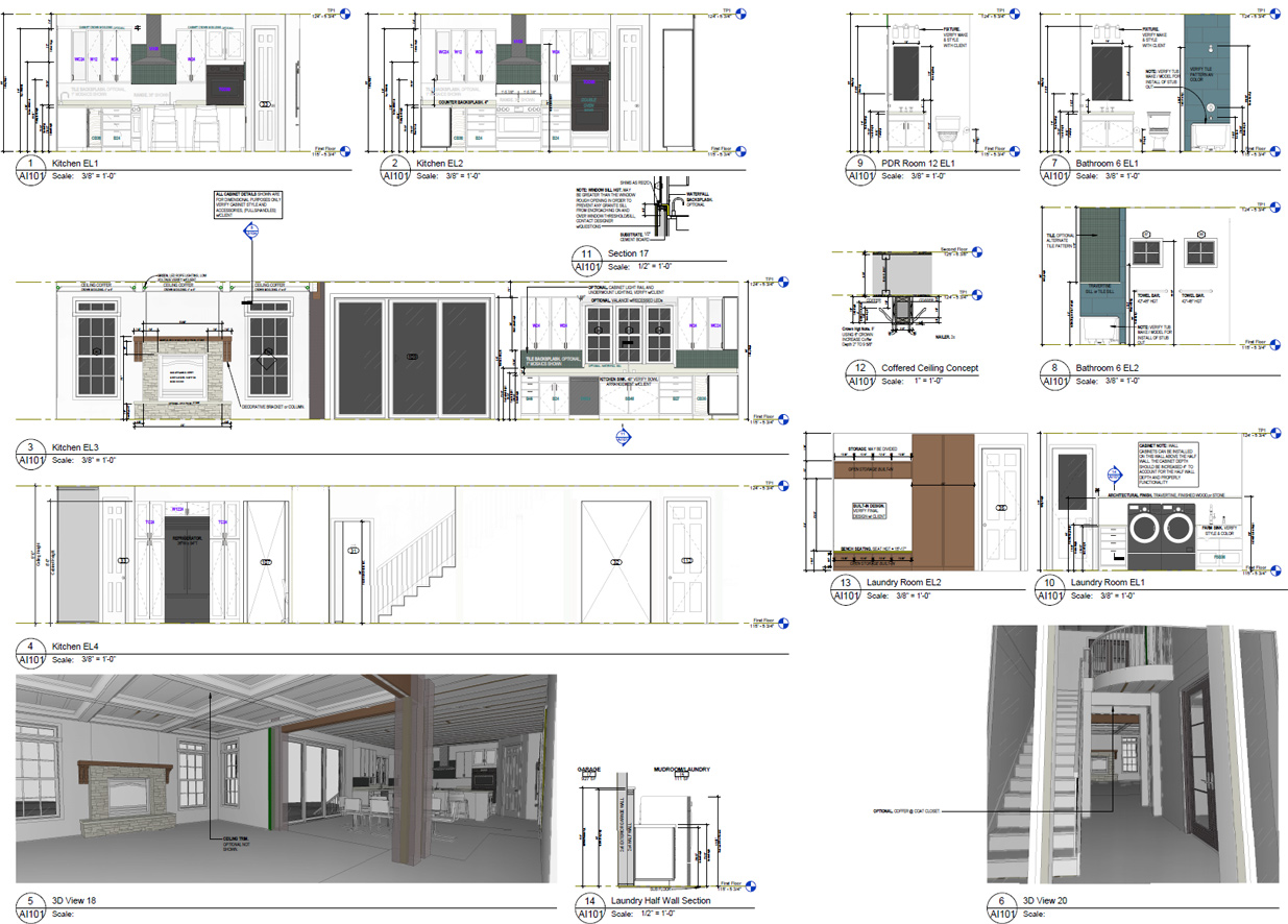 Every project is different, but our standard residential plan sets include the sheets and details most jurisdictions require for a smooth IRC permit review—plus a few extras that make life easier for your contractor. The amount and number of drawing sheets for any particular project will vary depending on how much information is required to accurately explain the project to builders and reviewers. Below is an example of the types of sheets and views you could expect to find in a typical new home construction documentation set: