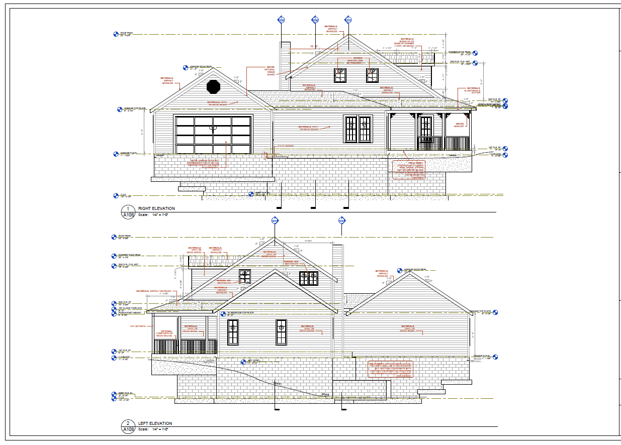 - A-200 – Exterior Elevations: Materials, overall height, grade plane reference.